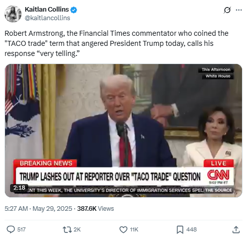 This post refers to Trump’s angry response during a press briefing to being questioned about the “TACO trade”—a term describing investors’ strategies around his tariffs. The tweet went viral as it highlighted Trump’s sensitivity to criticism and the evolving relationship between political actions and market reactions.