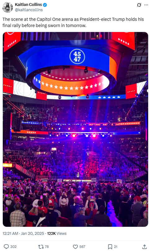 “The scene at the Capitol One arena as President-elect Trump holds his final rally before being sworn in tomorrow.”