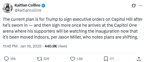 “The current plan is for Trump to sign executive orders on Capitol Hill after he’s sworn in — and then sign more once he arrives at the Capitol One arena where his supporters will be watching the inauguration now that it’s been moved indoors, per Jason Miller, who notes plans are shifting.”