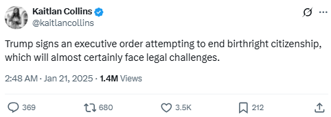 “Trump signs an executive order attempting to end birthright citizenship, which will almost certainly face legal challenges.”