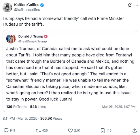 “Trump says he had a ‘somewhat friendly’ call with Prime Minister Trudeau on the tariffs.”