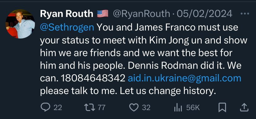 Routh bizarrely asked Hollywood actors to broker peace with North Korea—citing Dennis Rodman as proof and sharing his own contact info for follow-up.