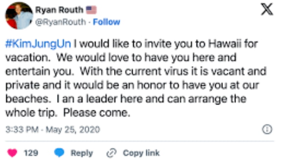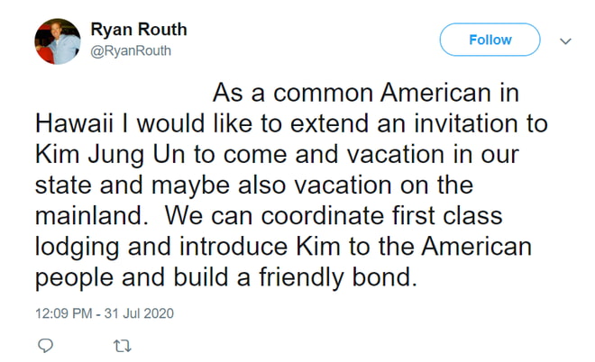 In another surreal outreach, Routh invited the North Korean dictator to Hawaii for a COVID-era beach getaway.
