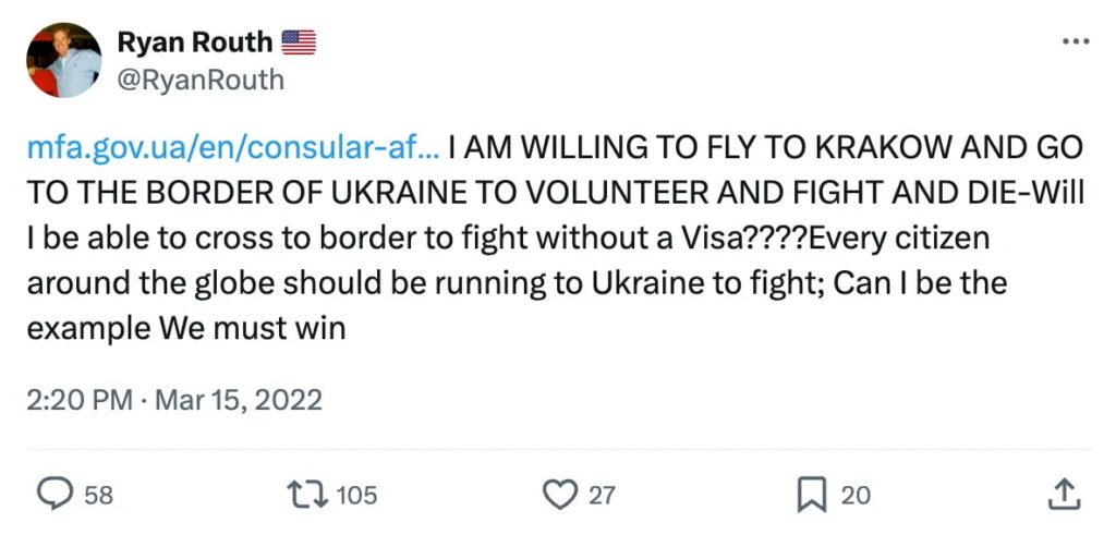 Routh also frequently posted about the war in Ukraine. In 2022, he said he was ready to fly to the border to fight. “I am willing to go and fight and DIE to beat Putin,” he wrote. According to reports, he even traveled to Ukraine that year to help recruit ex-Afghan soldiers who had fled the Taliban.