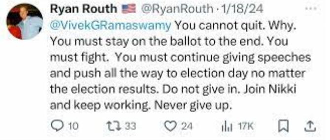 In an overly dramatic pep talk, Routh urged Vivek Ramaswamy to stay in the race, rally with Nikki Haley, and ignore all election outcomes.