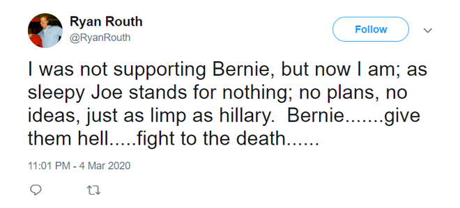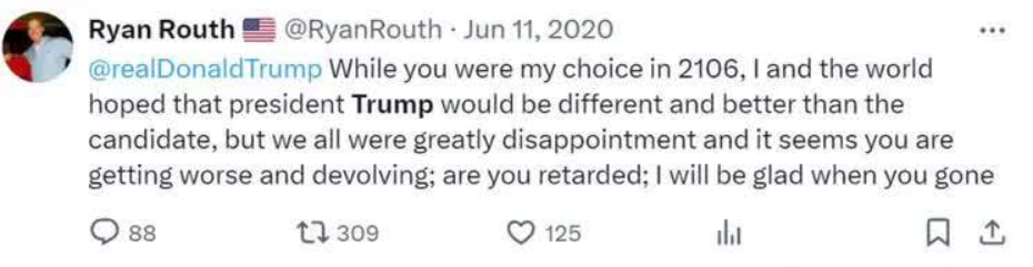 Back in 2016, Routh said he voted for Trump. But by 2020, he was openly critical of the former president. In one post, he wrote: “While you were my choice in 2016, I and the world hoped that president Trump would be different and better… but we all were greatly disappointed… I will be glad when you [are] gone.”