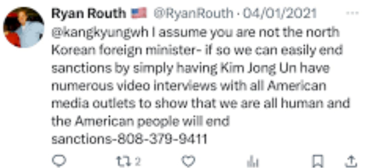 Routh theorized that media appearances by Kim Jong Un would be enough to end sanctions—then casually dropped his phone number.