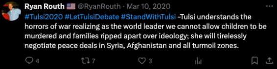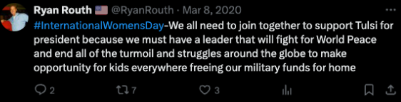 Routh framed Tulsi Gabbard as a global peace negotiator, portraying her as the only candidate capable of ending international conflicts.