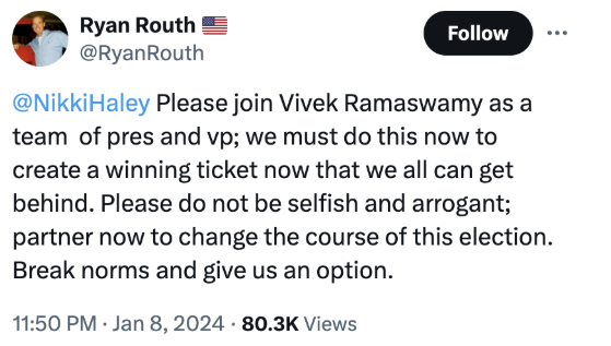 “@NikkiHaley Please join Vivek Ramaswamy as a team of pres and vp; we must do this now to create a winning ticket now that we all can get behind. Please do not be selfish and arrogant; partner now to change the course of this election. Break norms and give us an option.”