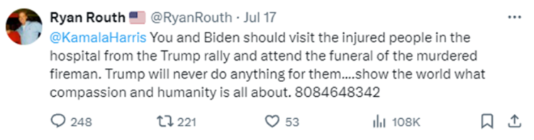 Routh oddly calls for compassion from political rivals while inserting his personal phone number for no apparent reason.