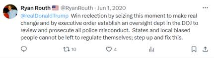 Routh urged Trump to win votes by cracking down on police abuse, calling for federal oversight over local law enforcement.