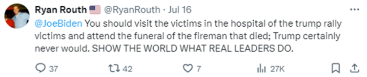 In a nearly identical message, Routh shifted his focus to President Biden, urging him to lead by example following a violent incident.