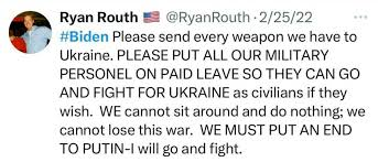 Routh proposed sending all U.S. weapons and essentially converting the military into unpaid volunteers to fight Russia—offering himself up first.