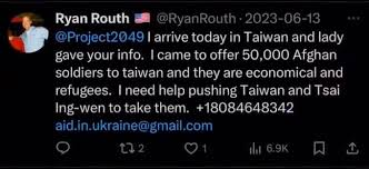 Routh claimed to be on the ground in Taiwan trying to arrange a military-like refugee transfer—with his email and number attached.