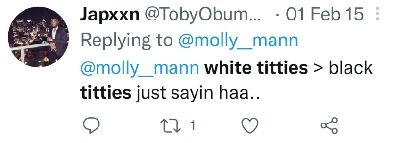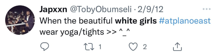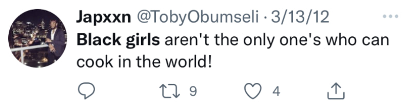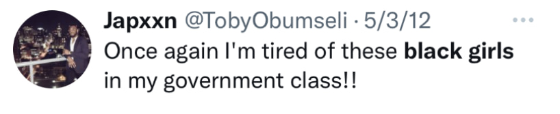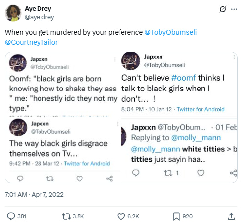 Attached to the tweet were screenshots of Obumseli’s old posts, including one where he wrote, “Can’t believe #oomf thinks I talk to black girls when I don’t…” and another comparing “white titties > black titties.” These tweets served as evidence for many that Obumseli had publicly disrespected Black women for years.