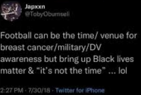“Football can be the time/ venue for breast cancer/military/DV awareness but bring up Black lives matter & ‘it’s not the time’ … lol”