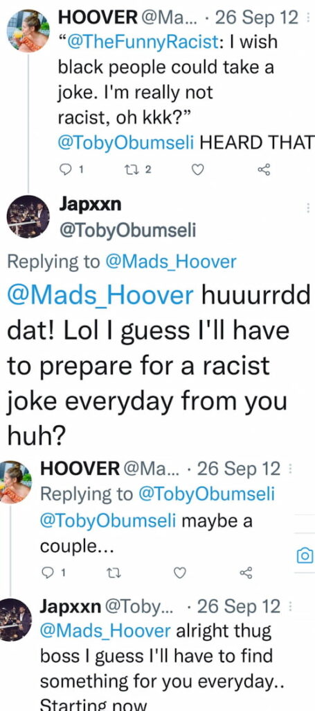 “@Mads_Hoover huuurrrdd dat! Lol I guess I’ll have to prepare for a racist joke everyday from you huh?”