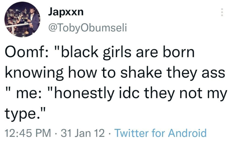 “Oomf: ‘black girls are born knowing how to shake they ass’ me: ‘honestly idc they not my type.’”