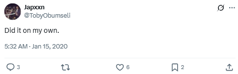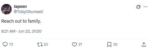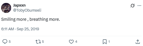 A self-empowerment tweet that gained darker relevance after his death. Reports show that Obumseli endured abuse alone, as documented in iCloud messages revealing stabbings and injuries prior to the fatal incident. His independence may have prevented him from seeking help.