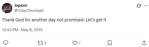 This tweet reflects pride and prayer after a productive year. Tragically, less than three years later, Obumseli would be dead. The contrast between his dedication and the violence he faced underscores the unseen personal dangers behind success narratives.