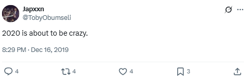 This tweet gained retrospective irony as 2020 brought global upheaval, including the COVID-19 pandemic and the murder of George Floyd. Obumseli’s own life would also take a tragic turn—he was killed in April 2022 by his girlfriend, Courtney Clenney. The tweet’s replies later referenced the term “Becky,” pointing to racial and cultural tensions. His post, once lighthearted, now reads as foreshadowing a year of personal and societal crisis.