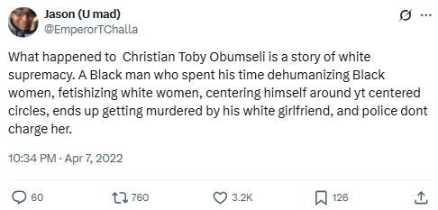 “What happened to Christian Toby Obumseli is a story of white supremacy. A Black man who spent his time dehumanizing Black women, fetishizing white women, centering himself around yt centered circles, ends up getting murdered by his white girlfriend, and police don’t charge her.”