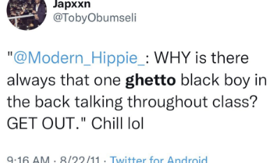 “@Modern_Hippie_: WHY is there always that one ghetto black boy in the back talking throughout class? GET OUT.” Chill lol