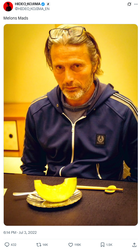 Kojima posted a photo of Mads Mikkelsen seated in front of a melon slice with a simple caption, “Melons Mads.” The post reflects the ongoing friendship and creative partnership between the two, which began during development of Death Stranding, where Mikkelsen played Clifford Unger. The tweet’s casual tone led to a wave of memes and replies from fans, blending humor with admiration. The Kojima-Mikkelsen connection was originally sparked through filmmaker Nicolas Winding Refn, showing how Kojima’s collaborations often emerge through cross-industry ties. The post adds to Mikkelsen’s strong online presence, frequently noted for his unique, serious expressions—even when posing with fruit.