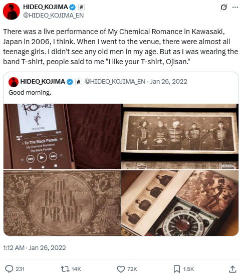 Kojima recalls attending a My Chemical Romance concert during the height of The Black Parade era. He found himself surrounded mostly by teenage fans and received a comment on his band shirt along with the label “Ojisan,” meaning “uncle” in Japanese. While the term typically refers to a middle-aged man, here it was used in a lighthearted way. Kojima’s story highlights both the generational gap at the event and his willingness to share casual, personal moments—something fans often find relatable and amusing.