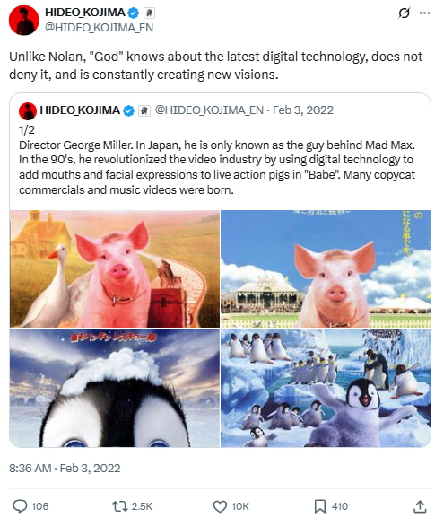 Kojima praises George Miller for embracing digital technology in filmmaking, calling him “God” in contrast to Christopher Nolan, who is known for sticking to traditional film techniques. Kojima points to Miller’s work on Babe and Happy Feet as examples of innovation, highlighting a creative mindset that adapts to technological change. As someone who constantly pushes the limits in game development, Kojima’s admiration for Miller’s flexible, forward-looking approach reflects his own values—and subtly critiques Nolan’s resistance to digital tools.