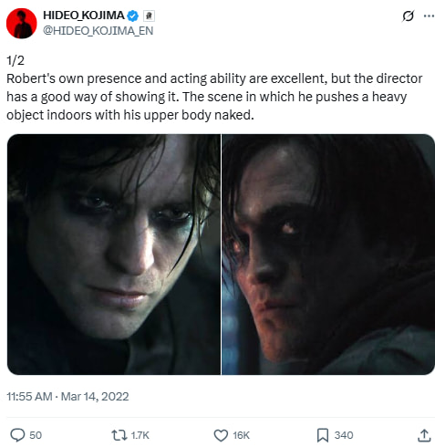 Kojima breaks down The Batman like it’s a character study for a role he’s directing. He’s analyzing back muscles and emotional sunglasses. Film Twitter could never.