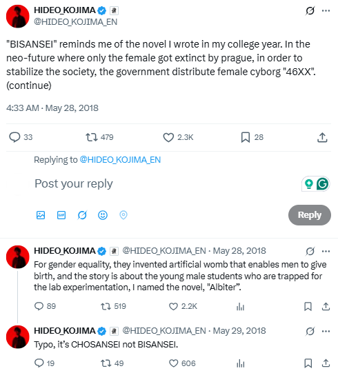 Kojima shares a concept from a dystopian novel he wrote in college where a plague wipes out females, prompting the government to distribute female cyborgs (“46XX”). Artificial wombs allow men to give birth, and young students become test subjects. It echoes sci-fi works that explore gender, survival, and bioethics—ideas that would later influence Death Stranding. Also, he corrects his own typo mid-thread, because even in dystopias, spelling matters.