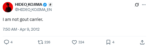 Kojima posted this short statement in 2012, likely responding to fan questions or rumors about his health. Gout had become a more talked-about issue in Japan at the time, especially among middle-aged men, due to lifestyle and dietary changes. With his known sense of humor and timing—right in the middle of development on Metal Gear Solid V—this tweet reads like a casual, slightly awkward health disclaimer. It also reflects how Kojima often mixes personal commentary with unexpected public updates, something he continued in later years with his podcast and other online appearances.