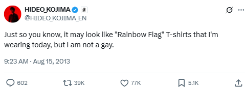 Kojima clarified that his rainbow T-shirt wasn’t a statement about his sexuality, likely due to the rainbow’s strong association with LGBT pride. The awkward phrasing—“I am not a gay”—sparked discussion online, often chalked up to translation quirks or non-native English use. Fans later reinterpreted the tweet humorously, especially in light of Kojima’s close creative partnerships and the emotionally layered male relationships in his games like Metal Gear Solid and Death Stranding. The tweet remains a strange but memorable Kojima moment.