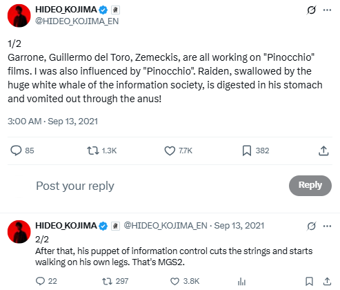 Kojima draws a direct parallel between Metal Gear Solid 2 and Pinocchio, describing Raiden’s arc as a journey from manipulation to autonomy. The “white whale of the information society” refers to digital systems that control perception, echoing Arsenal Gear’s collapse in the game’s ending. Kojima likens this moment of escape to being “vomited out through the anus,” a blunt metaphor symbolizing Raiden’s chaotic liberation. The reference underlines Kojima’s long-standing critique of media control and misinformation, themes that remain relevant today. His post reinforces how MGS2 acts as a commentary on digital manipulation and independence in the modern world.