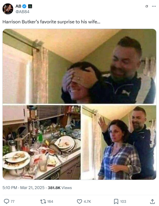 A meme showing a man revealing a kitchen full of dirty dishes to his wife—used here to mock NFL kicker Harrison Butker’s views on women.