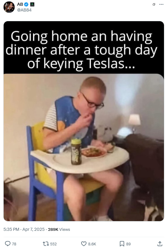 Brown posts a meme of a grown man in a high chair eating dinner, sarcastically captioned as if mocking someone who spent their day vandalizing luxury cars. No further context, just internet chaos.