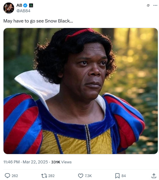 Brown shares a photoshopped image of Samuel L. Jackson in a Snow White costume, adding a one-liner that instantly turned the meme into viral humor.