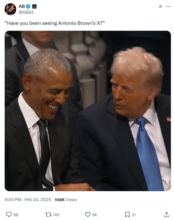 Brown captions a viral photo of Obama and Trump with a fake conversation starter, referencing himself for comedic effect.