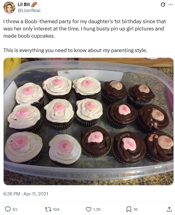 “I threw a Boob-themed party for my daughter’s 1st birthday since that was her only interest at the time. I hung busty pin up girl pictures and made boob cupcakes.