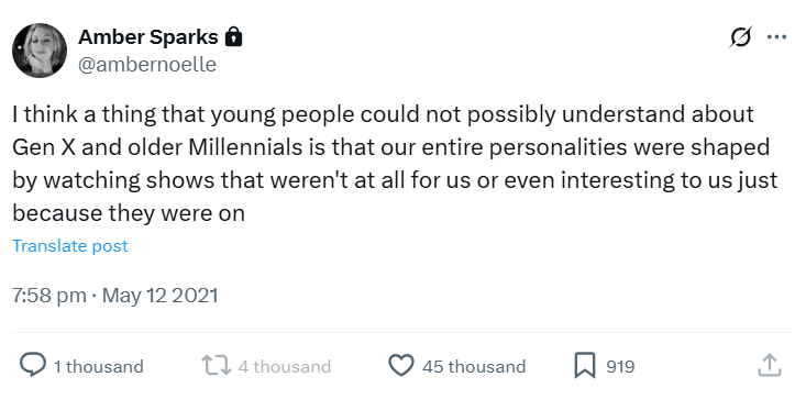 I think a thing that young people could not possibly understand about Gen X and older Millennials is that our entire personalities were shaped by watching shows that weren’t at all for us or even interesting to us just because they were on.