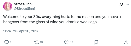 Welcome to your 30s, everything hurts for no reason and you have a hangover from the glass of wine you drank a week ago