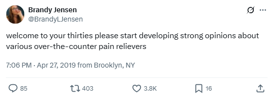 welcome to your thirties please start developing strong opinions about various over-the-counter pain relievers