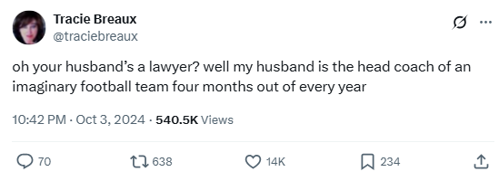 “oh your husband’s a lawyer? well my husband is the head coach of an imaginary football team four months out of every year”