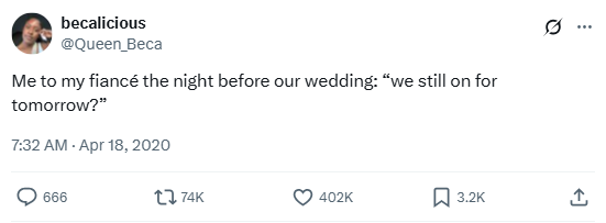 “Me to my fiancé the night before our wedding: ‘we still on for tomorrow?'”
