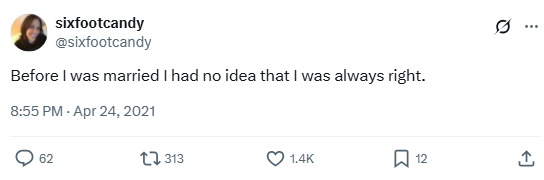 “Before I was married I had no idea that I was always right.”