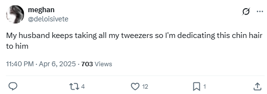 “My husband keeps taking all my tweezers so I’m dedicating this chin hair to him.”