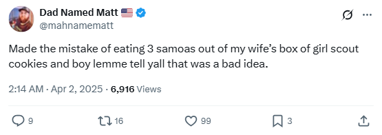 “Made the mistake of eating 3 samoas out of my wife’s box of girl scout cookies and boy lemme tell yall that was a bad idea.”