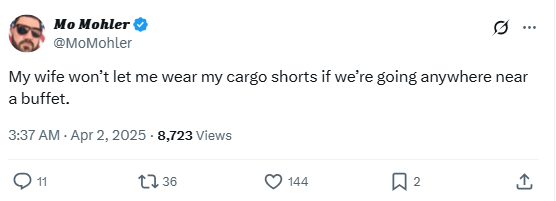 “My wife won’t let me wear my cargo shorts if we’re going anywhere near a buffet.”