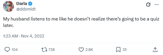 “My husband listens to me like he doesn’t realize there’s going to be a quiz later.”